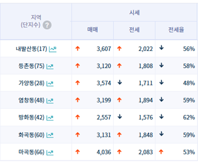화곡·등촌·가양·방화 등의 구축 위주의 지역 간 격차가 뚜렷해지고 있습니다.